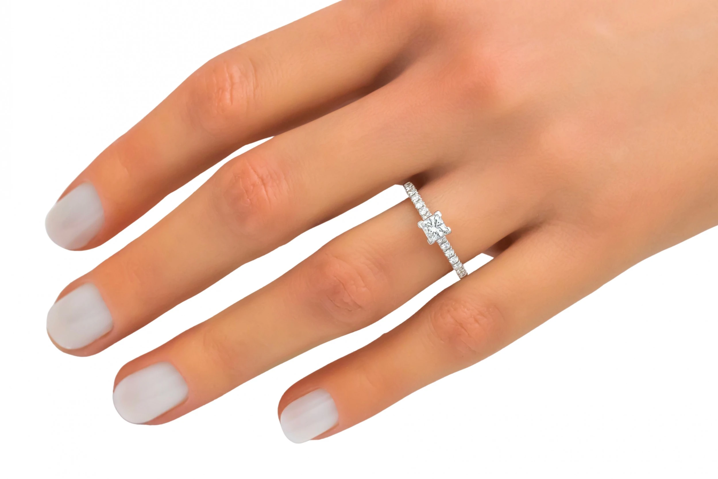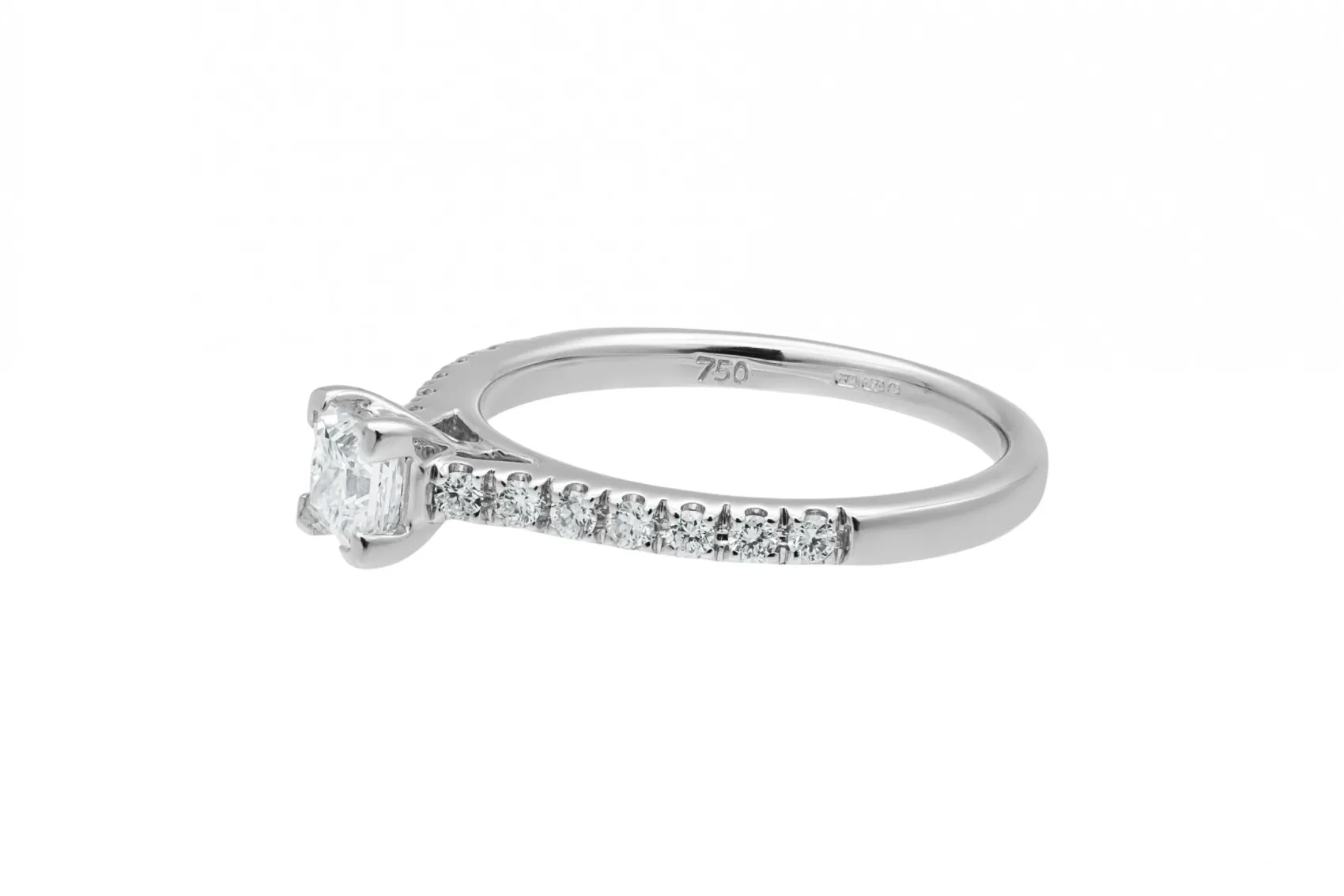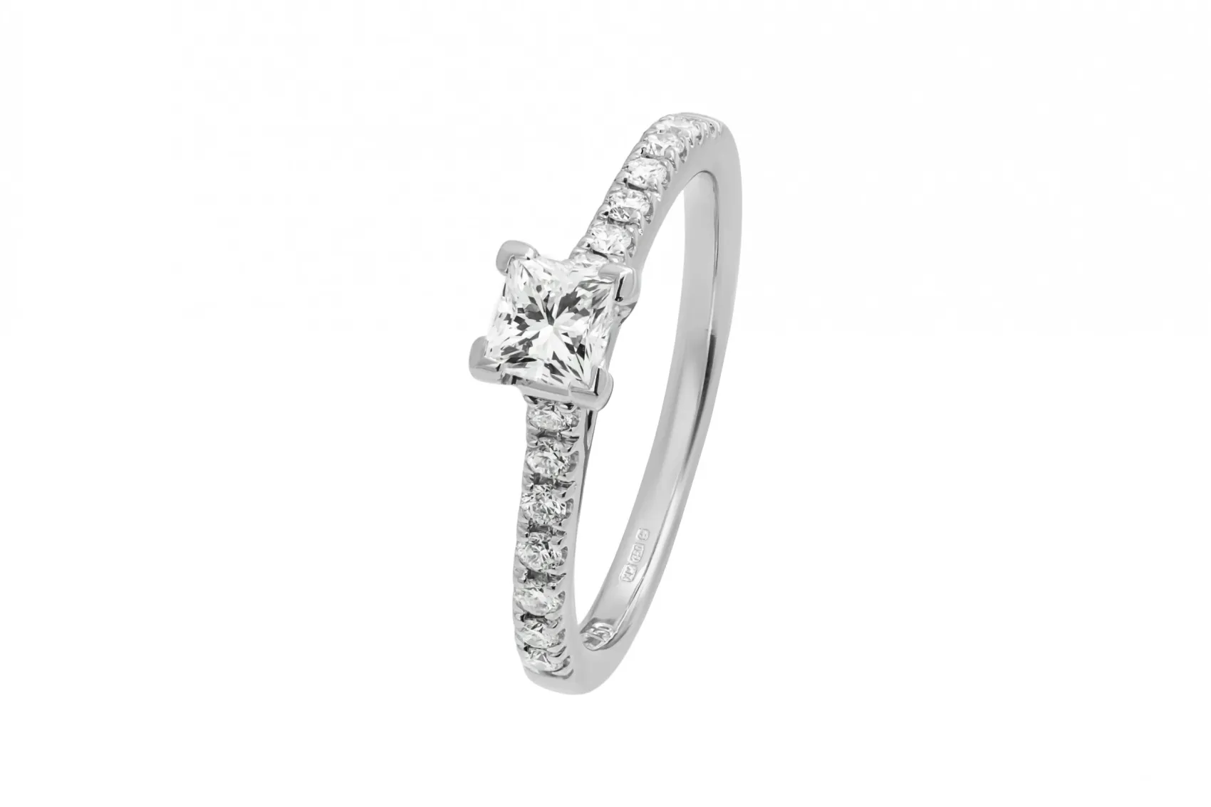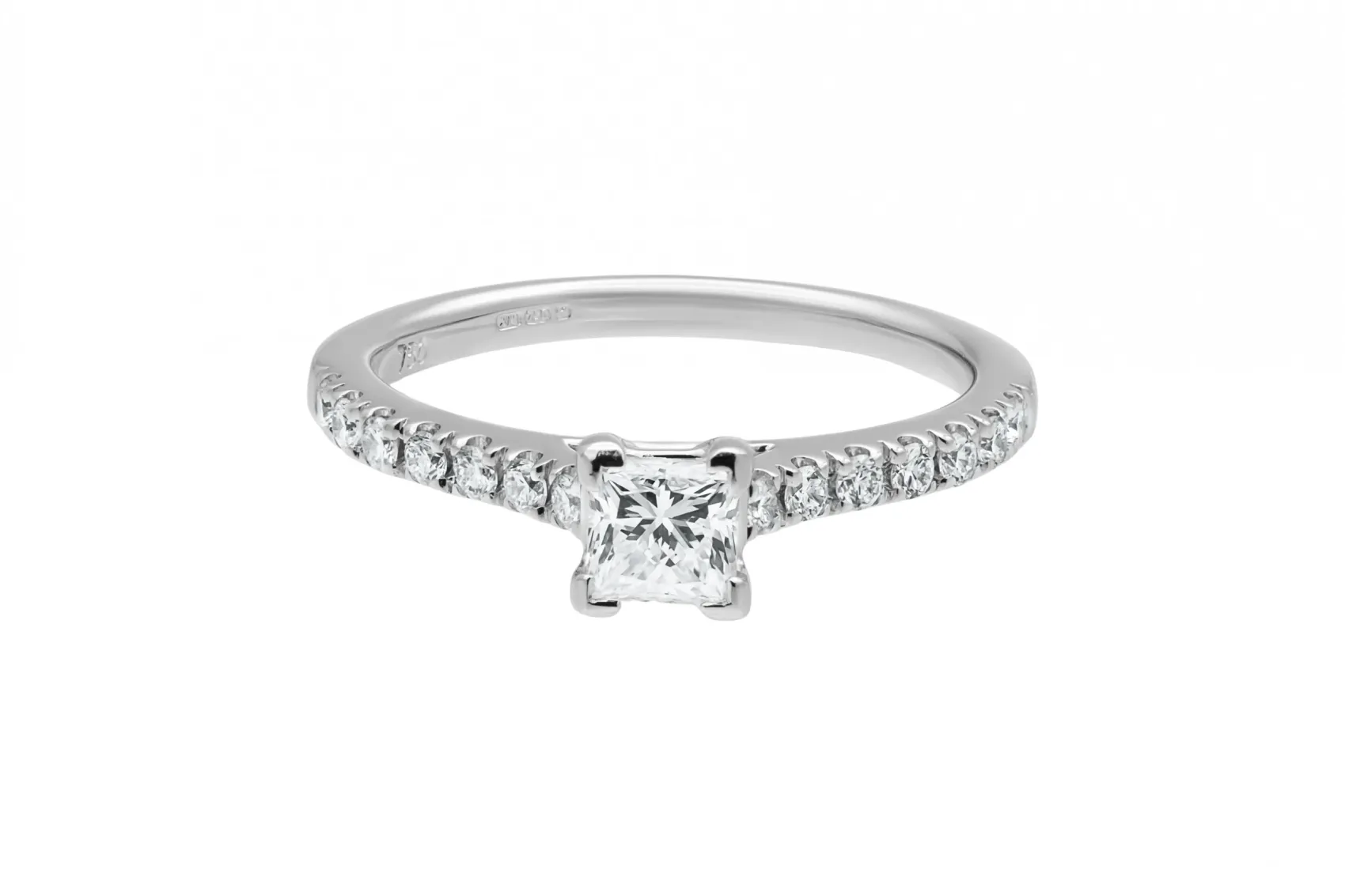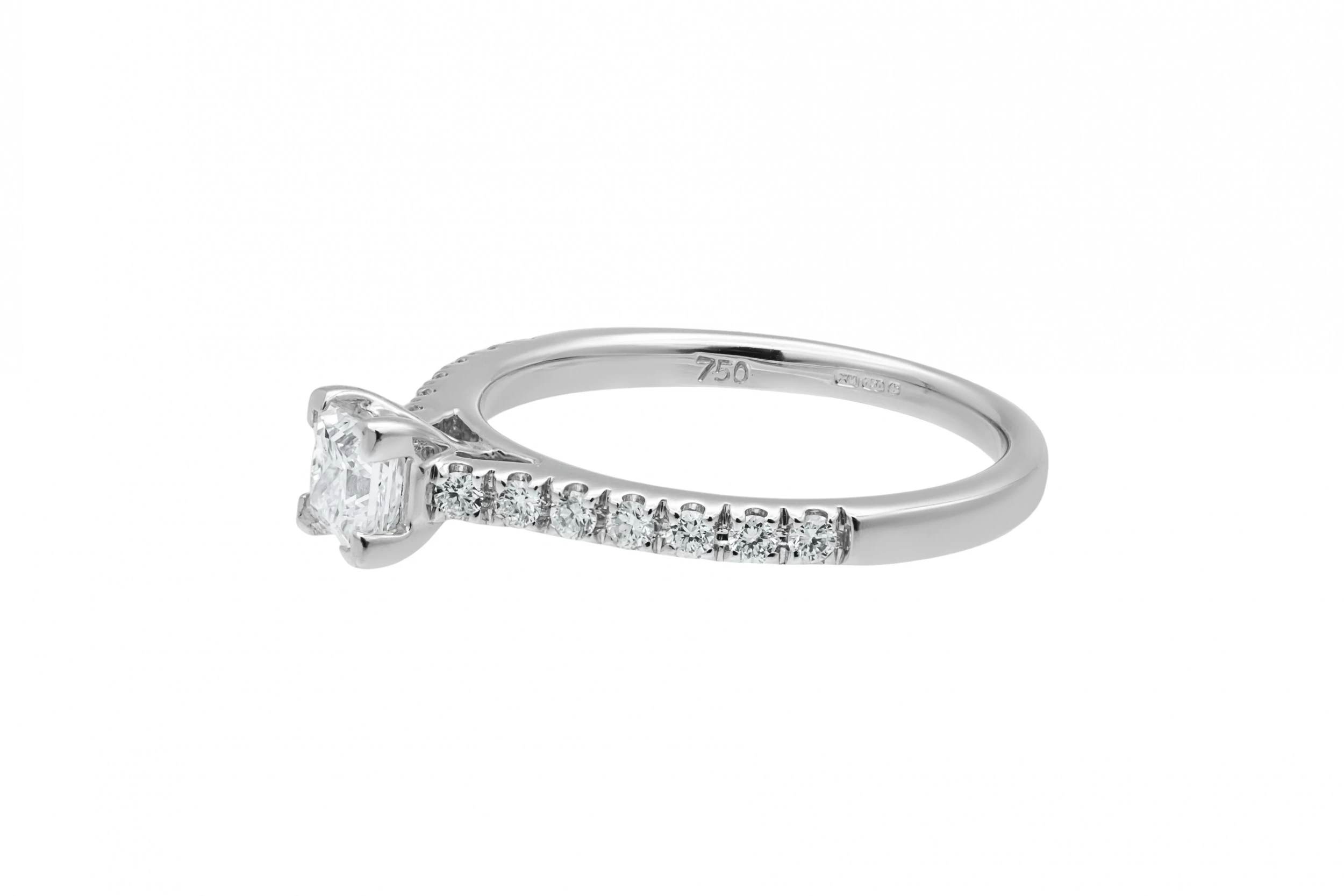 This refined 18ct white gold engagement ring features a princess cut diamond totalling 0.45ct, graded G colour for bright, clean brilliance.