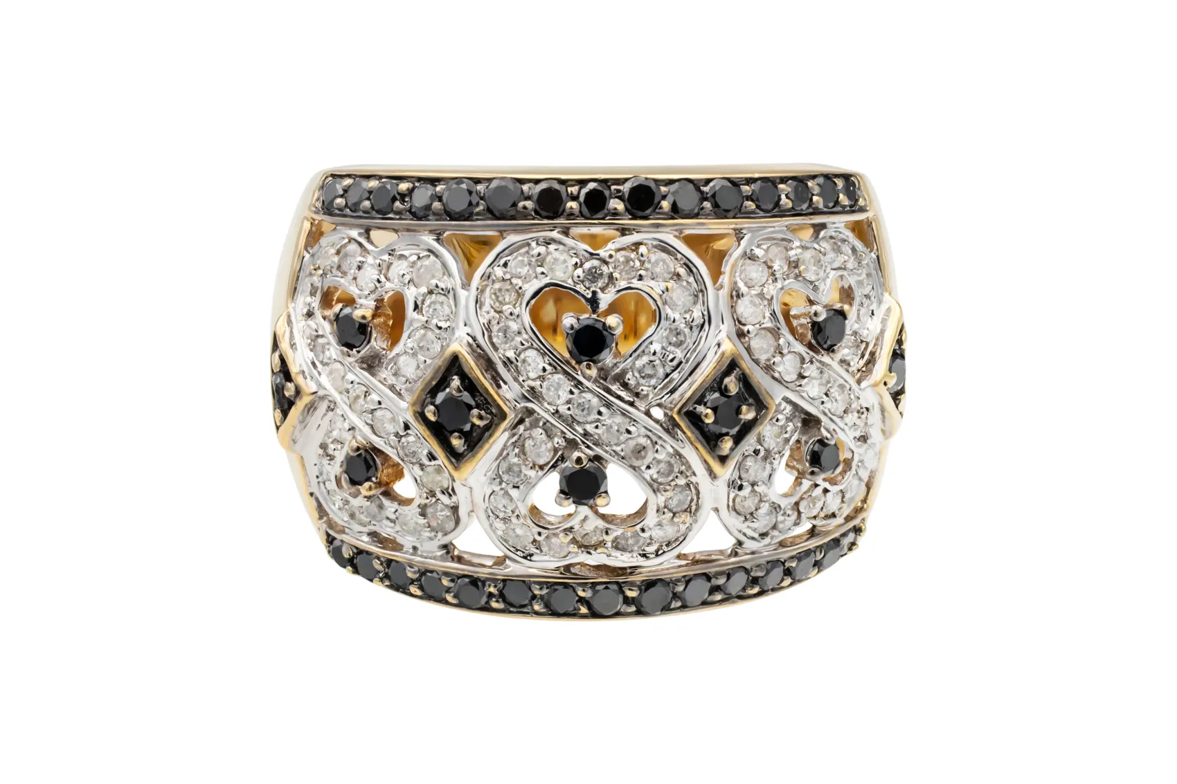 This stunning 9ct yellow gold black and white diamond ring features a total of 0.51ct of sparkling diamonds and weighs 5.6g, creating a striking contrast between bold black diamonds and classic white brilliance.