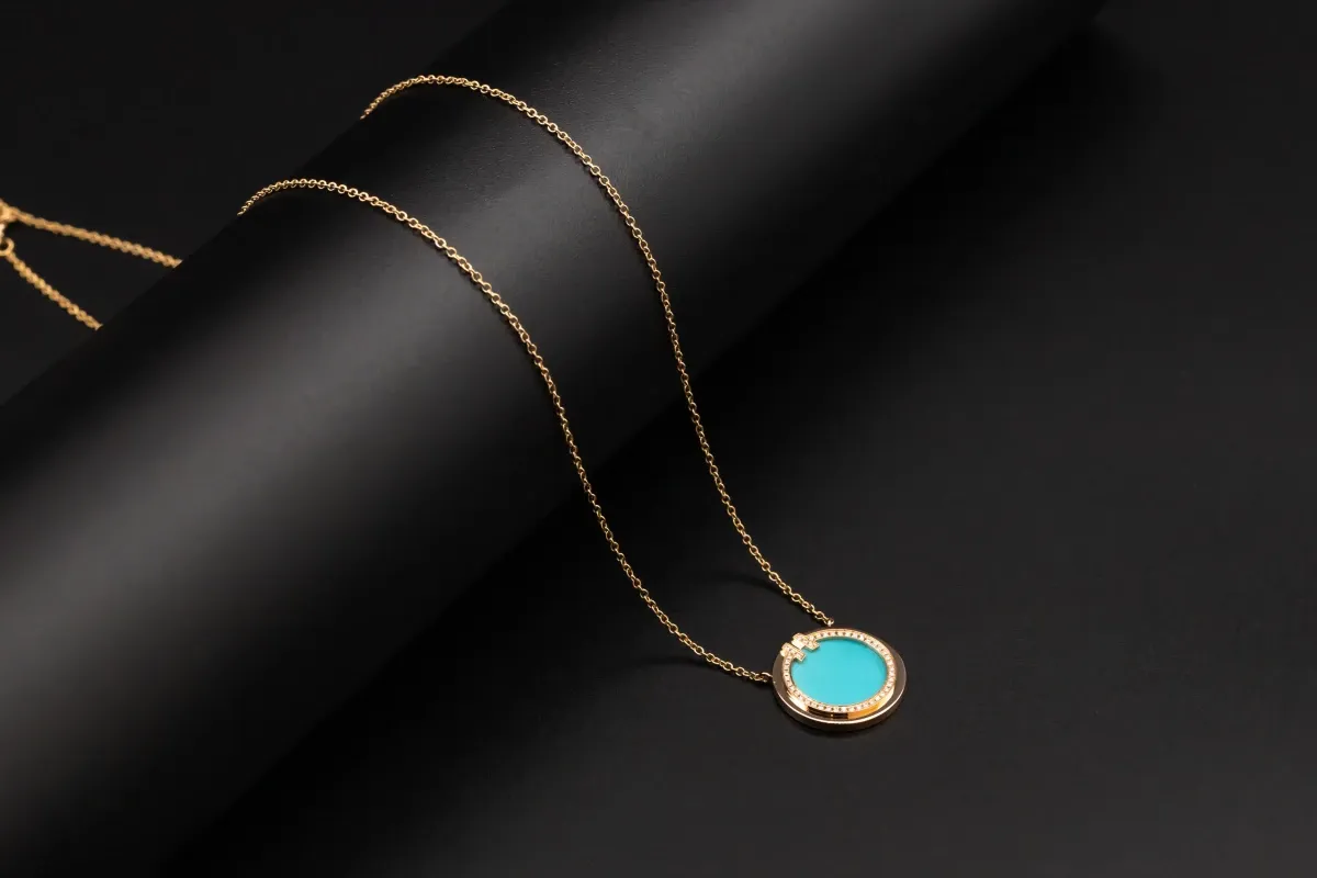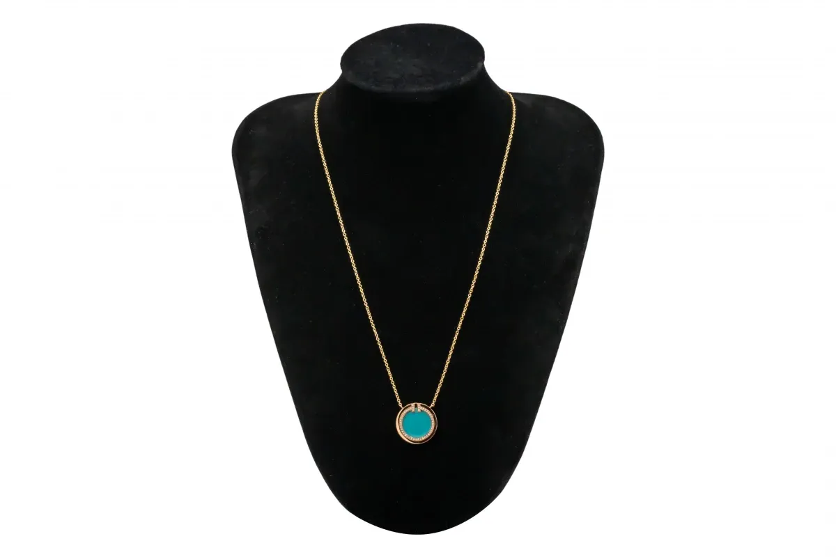 This stunning pendant necklace by Tiffany & Co features a beautiful combination of diamonds and turquoise in a circle pendant design.