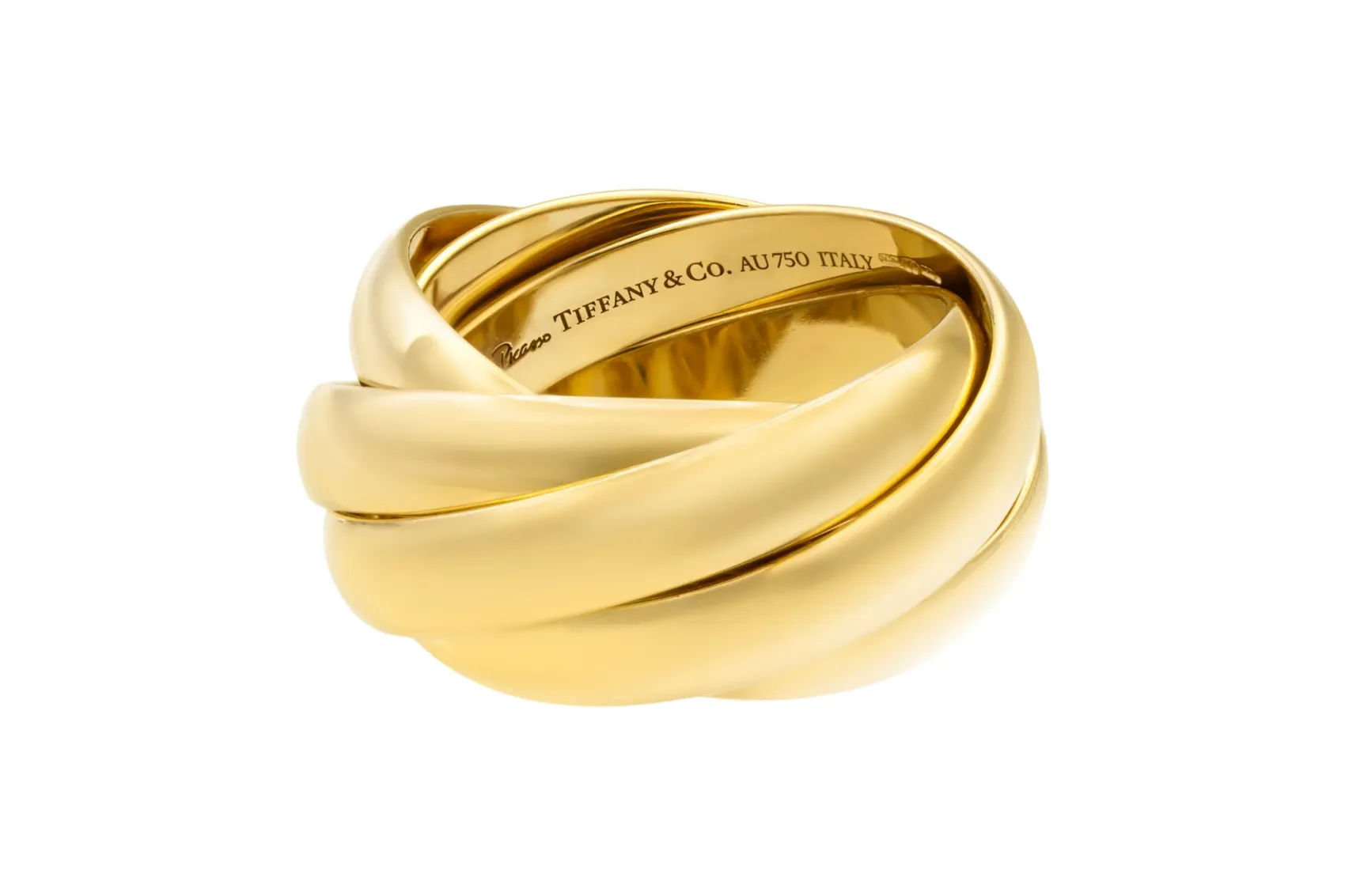 This striking Tiffany & Co. Paloma’s Melody ring is crafted in rich 18ct yellow gold and designed with five interlocking bands that create a harmonious, fluid movement with every gesture.