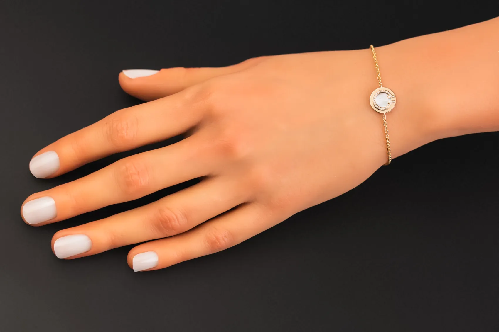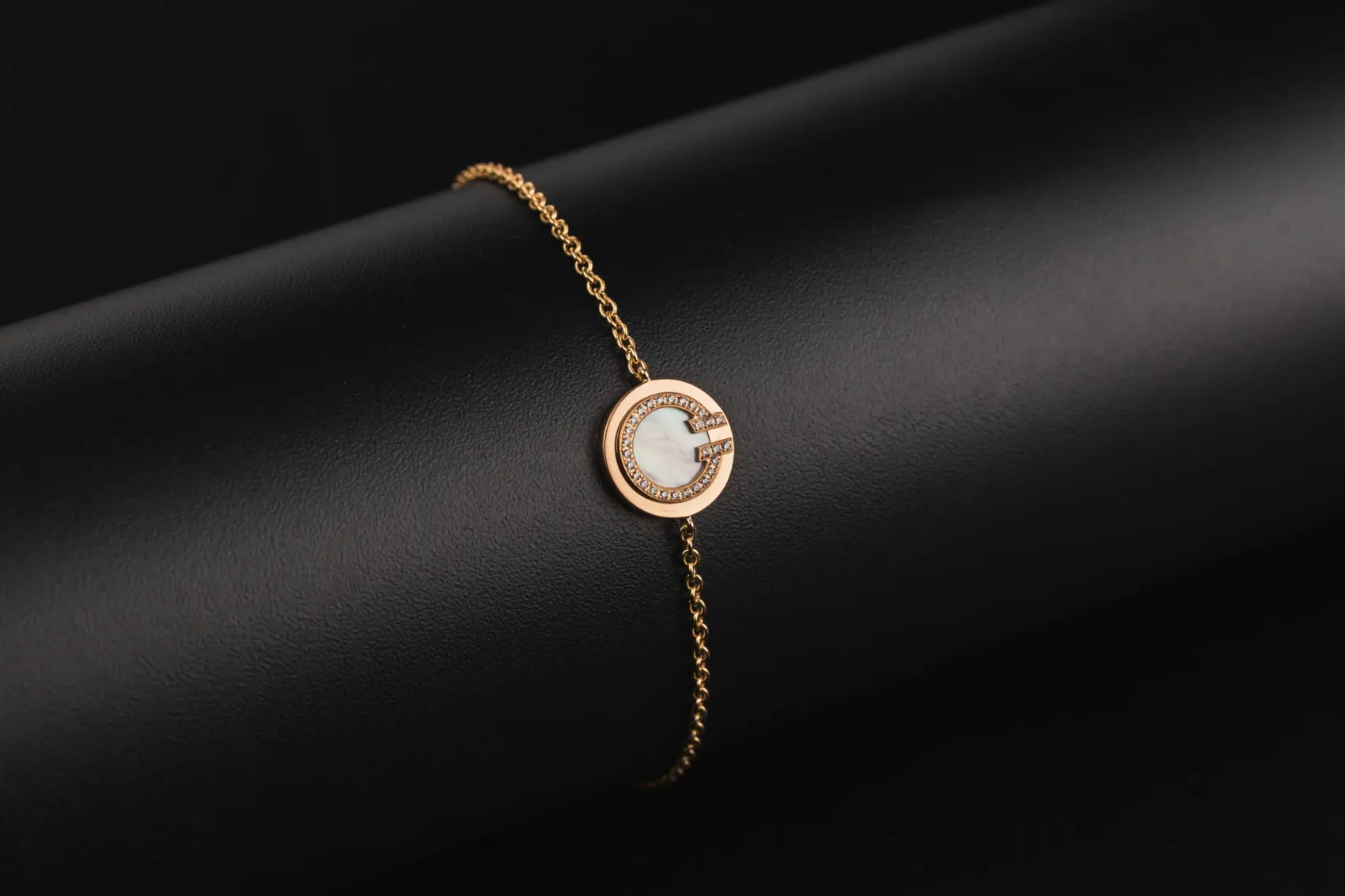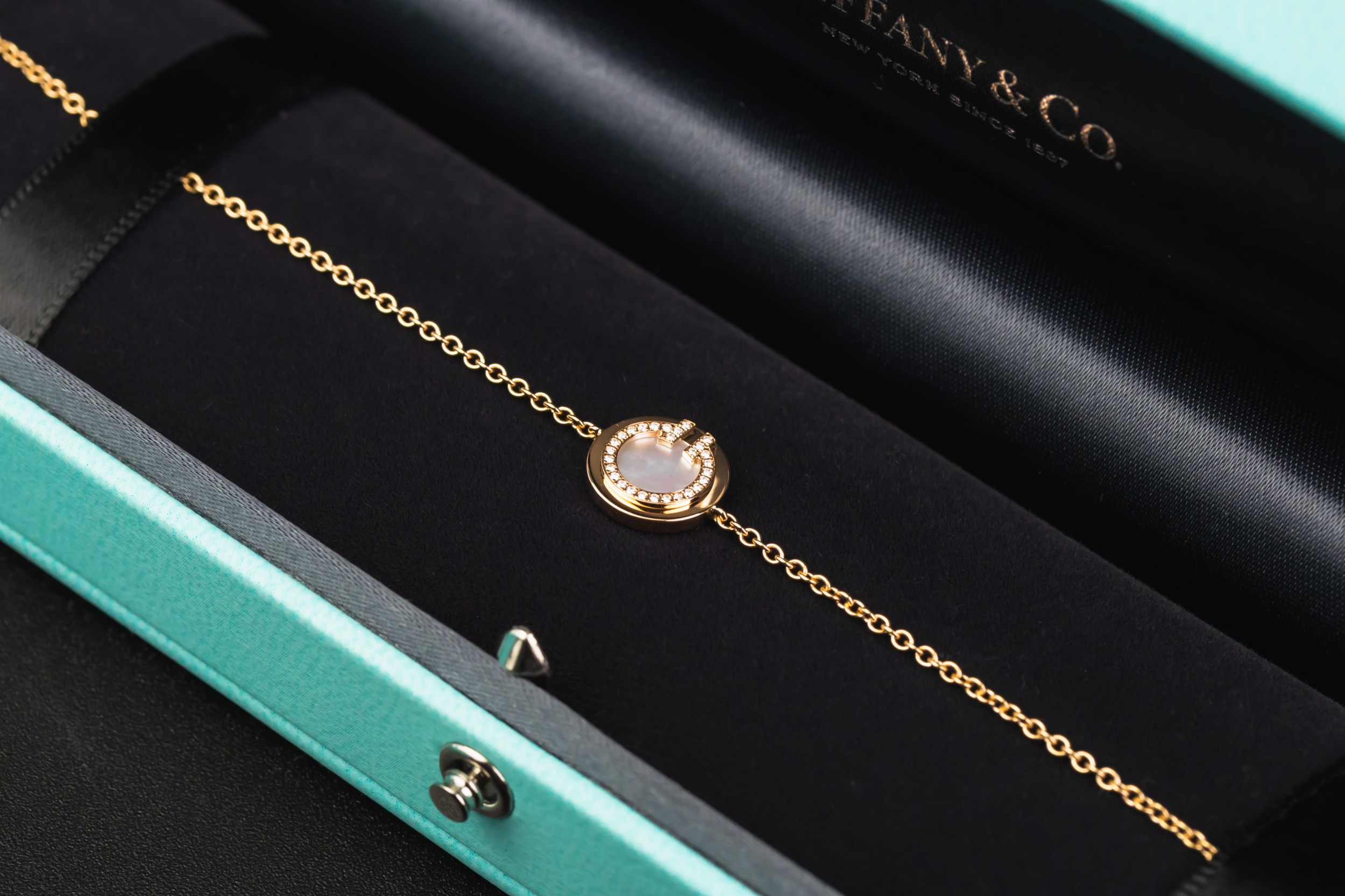 This elegant Tiffany & Co. T Circle bracelet is crafted in 18ct rose gold and features luminous mother-of-pearl accented with diamonds graded F colour and VS clarity for refined sparkle.