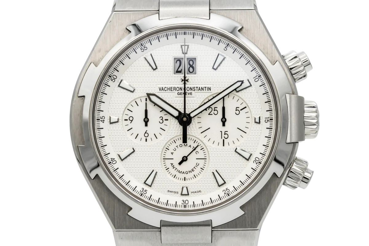 This 2018 Vacheron Constantin Overseas 42mm features a white dial with baton markers and a stainless steel bezel. It also features a smooth stainless steel bezel.