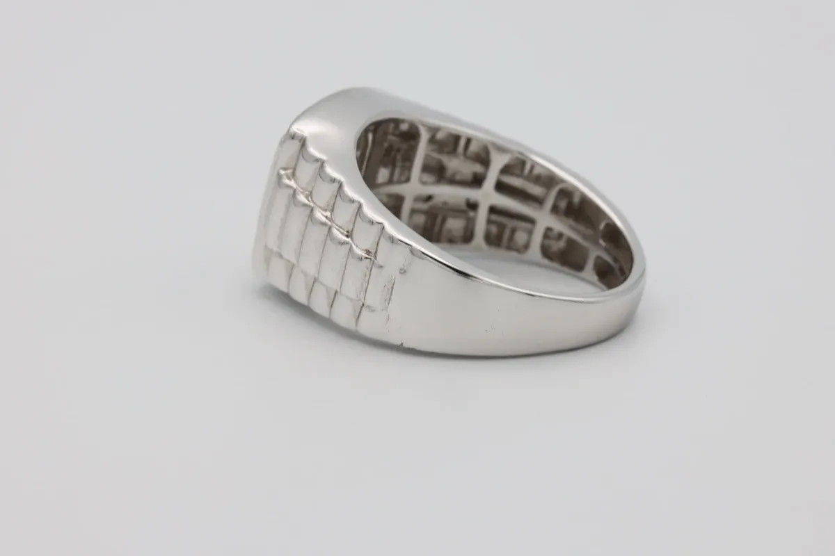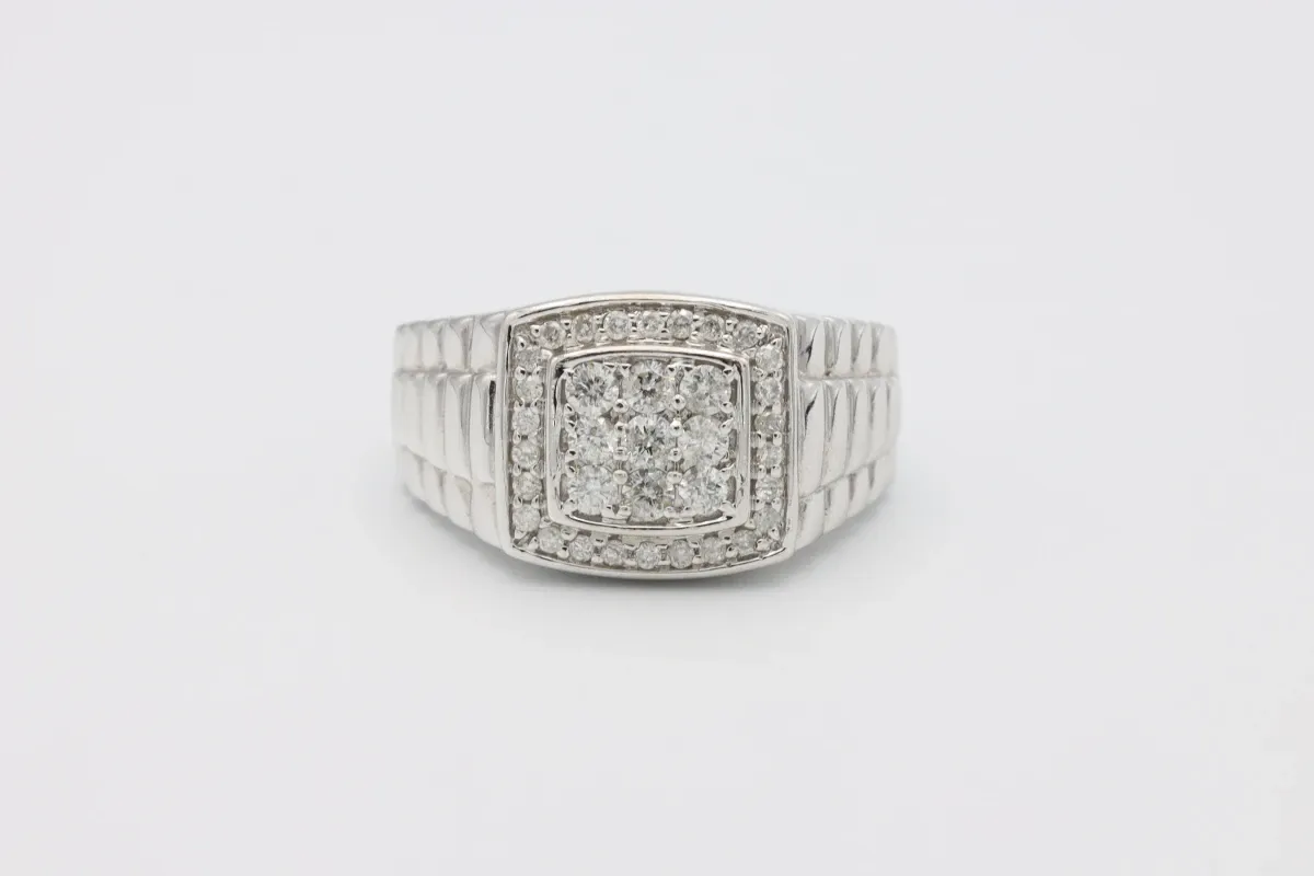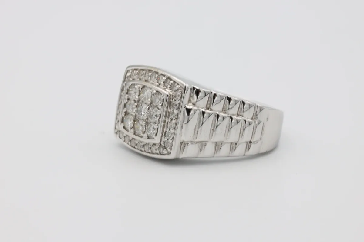 A striking gentleman’s ring crafted in solid 14ct white gold, featuring a bold president-style design with diamond-set. The ring is set with a total of 0.80 carats of SI1-clarity diamonds, offering excellent brilliance and a refined, masculine finish. Perfect as a statement piece or a distinguished everyday ring, this design combines classic prestige with modern craftsmanship.