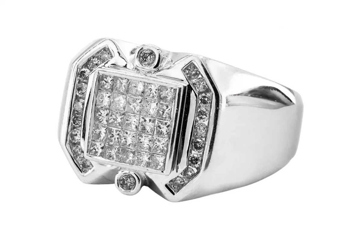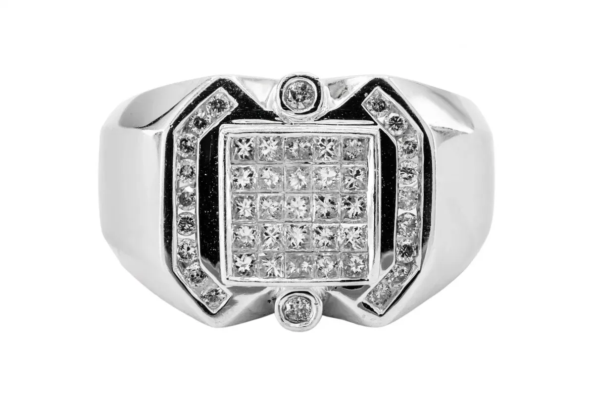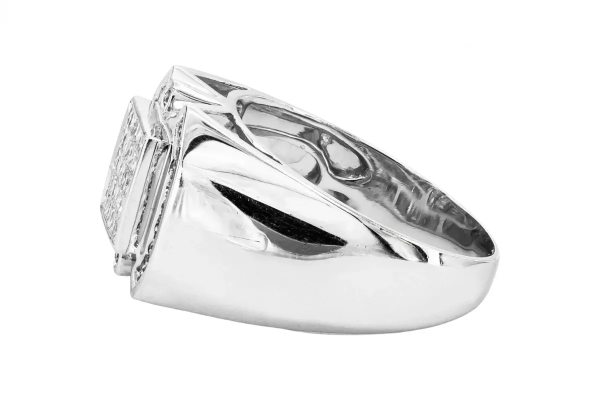14ct white gold diamond mens ring with invisible set princess cut diamonds and channel set brilliant cut diamonds on the sides.