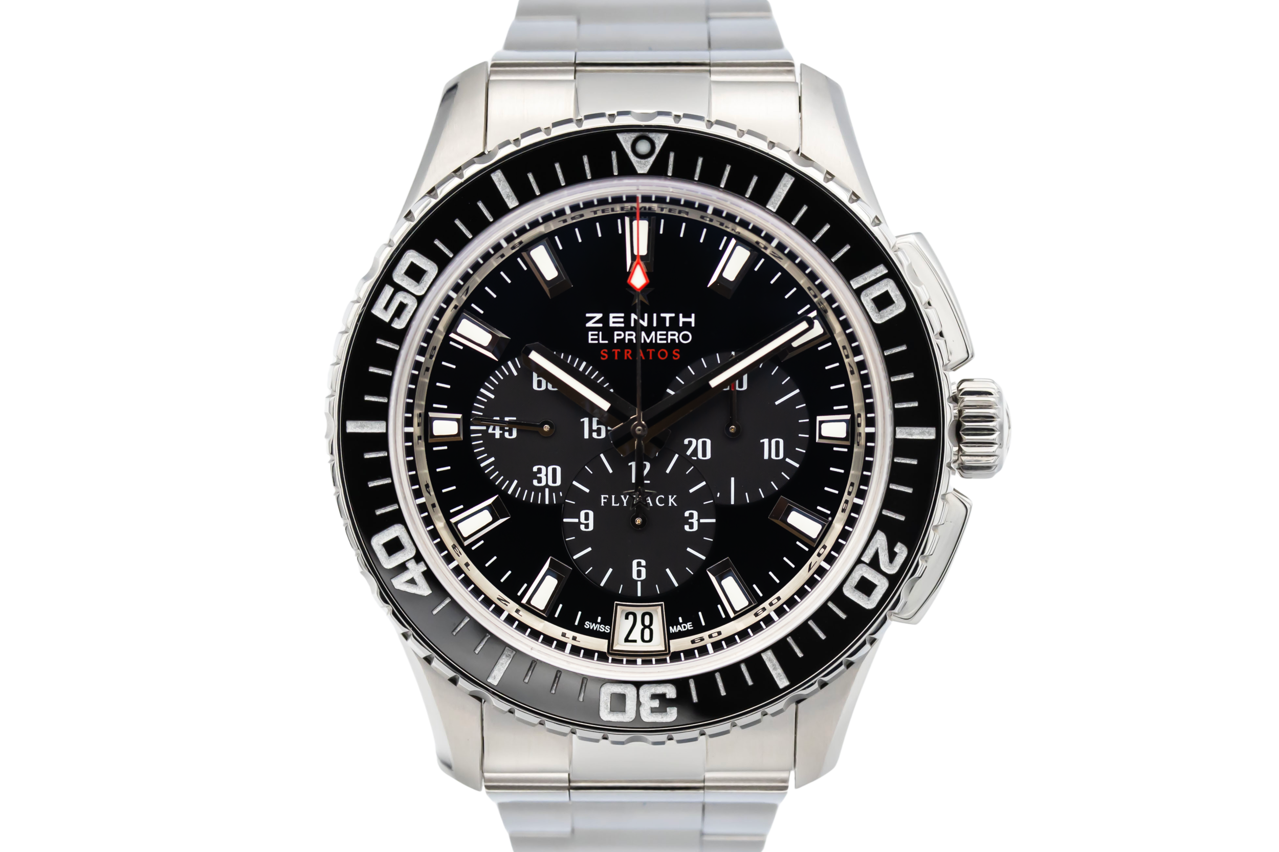finance this from £78.12 p/m call the shop Read about our Limited Lifetime WarrantyThis 2012 Zenith El Primero Stratos Flyback 46mm is a bold luxury chronograph crafted entirely from stainless steel. The black detailed dial features baton hour markers with contrasting chronograph sub-dials and a date display, offering excellent legibility and technical depth. Finished on the robust stainless steel bracelet with the distinctive tachymeter bezel.
