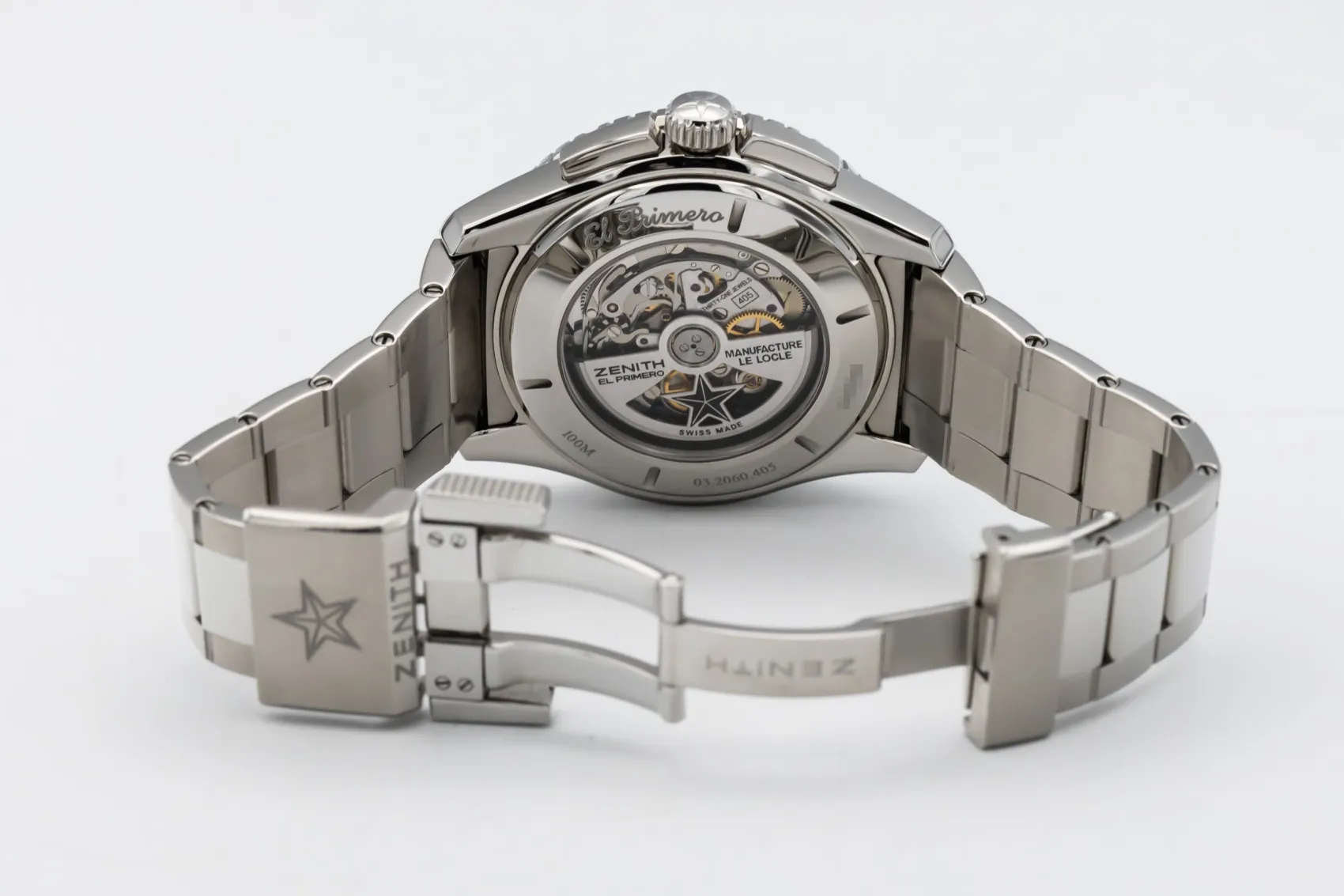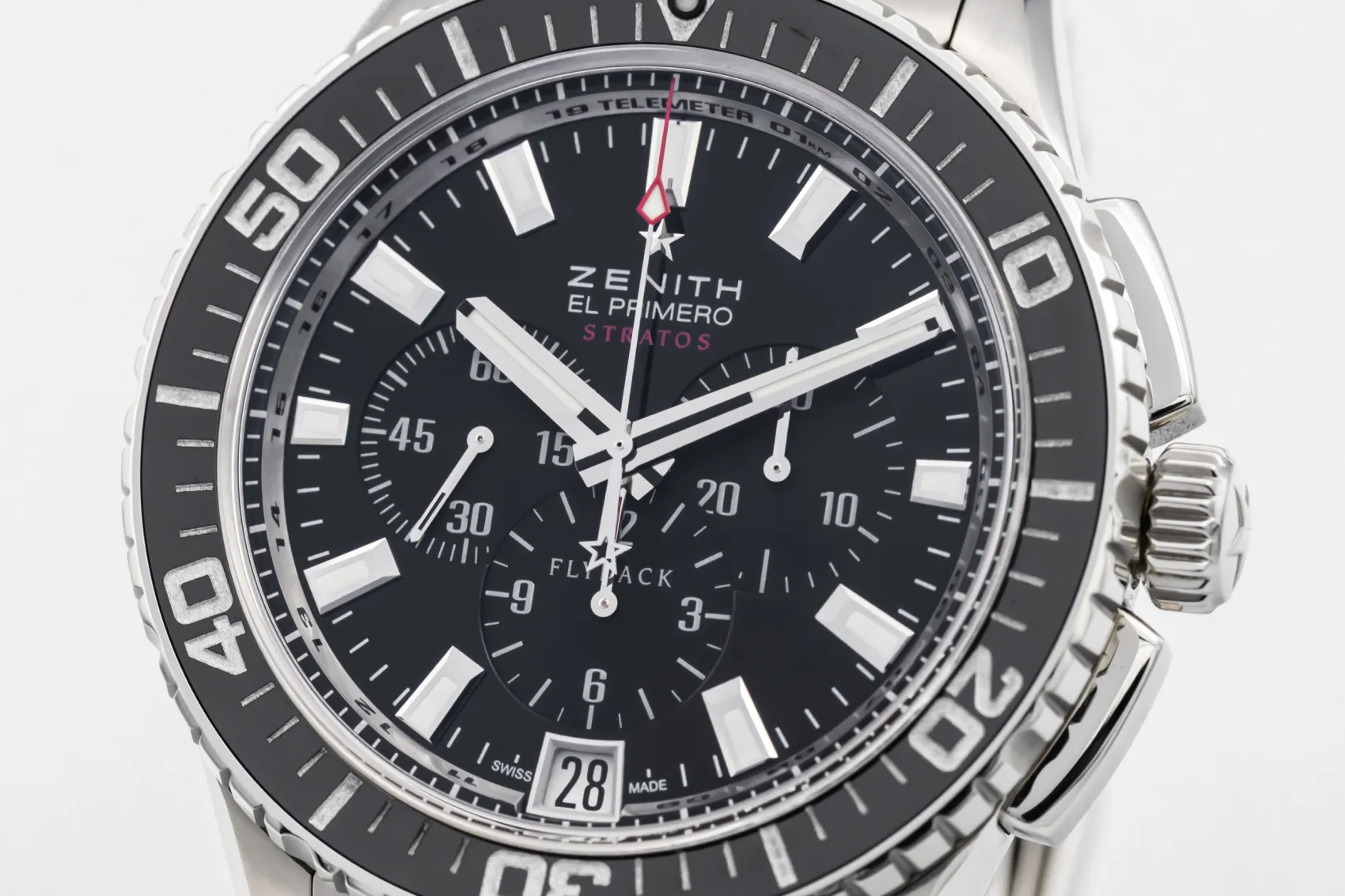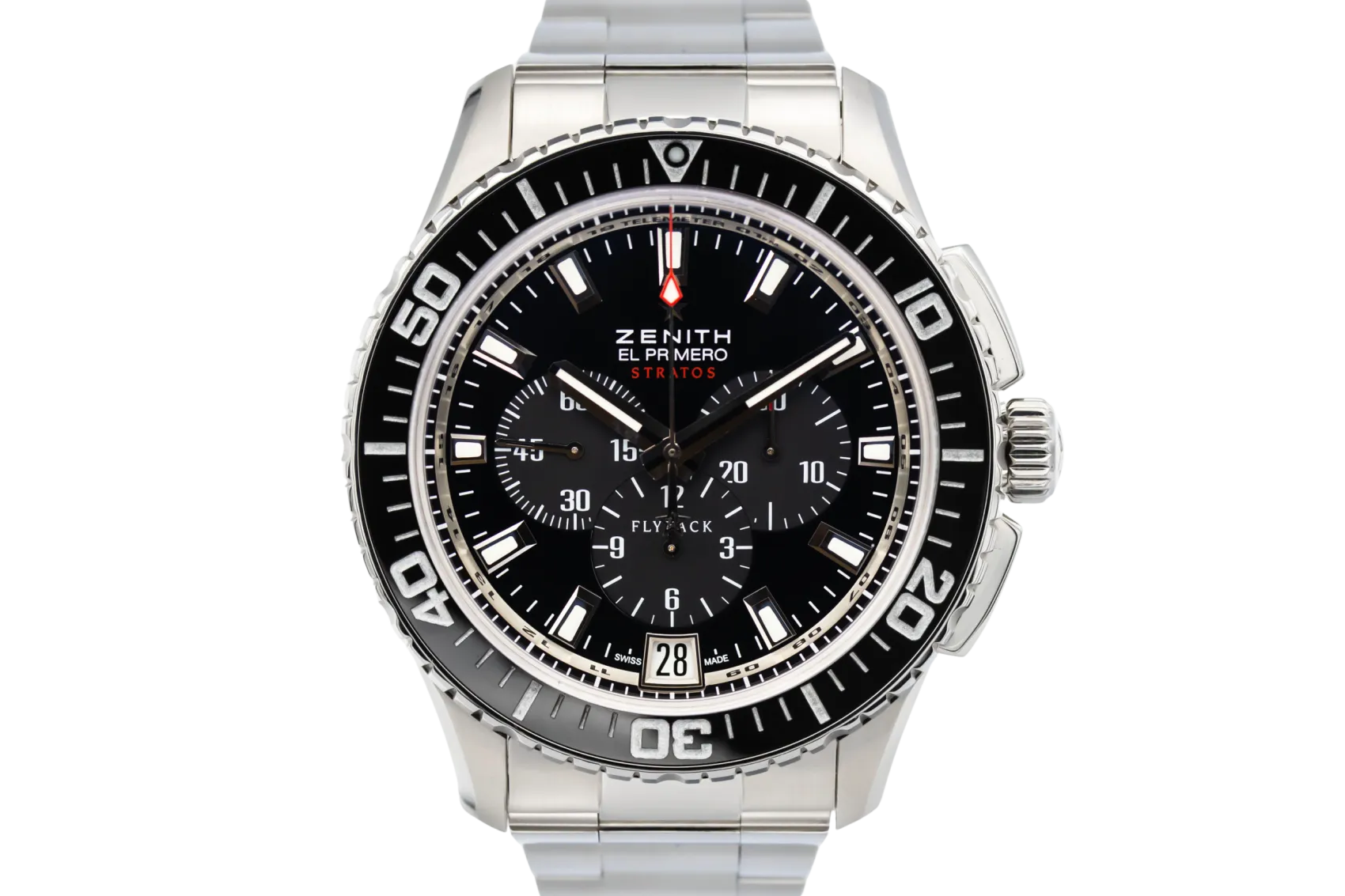 The Zenith El Primero is one of the most celebrated chronograph movements ever produced, first introduced in 1969. The Stratos Flyback model combines this legendary high-frequency movement with modern aviation-inspired design.